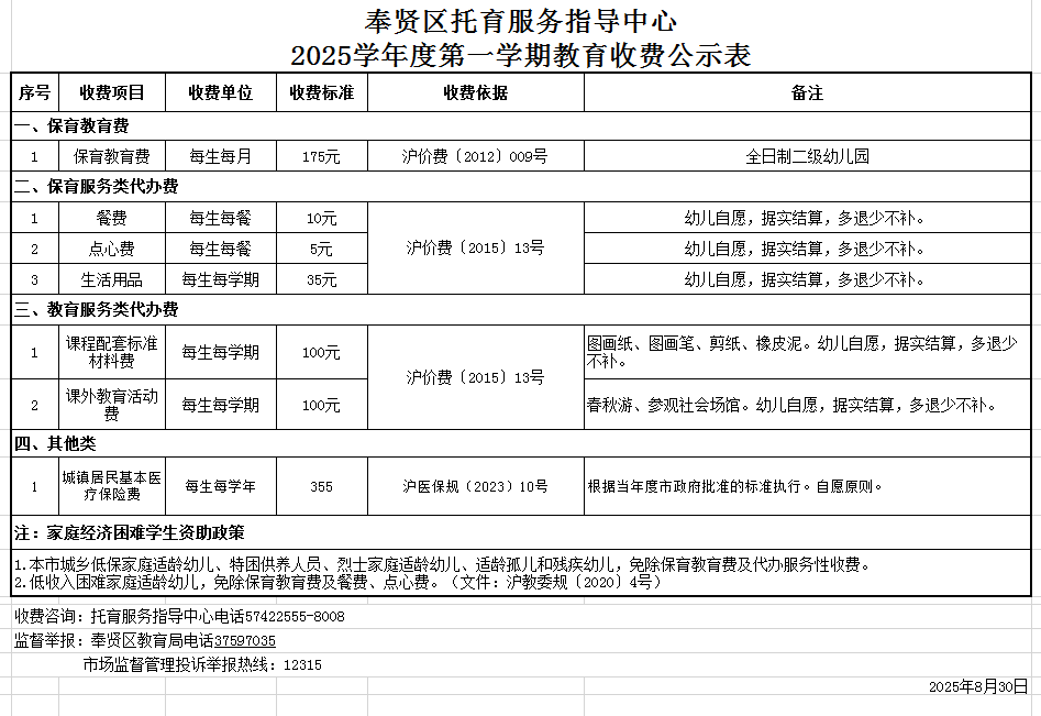 奉贤区托育服务指导中心 2025学年度第一学期教育收费公示表